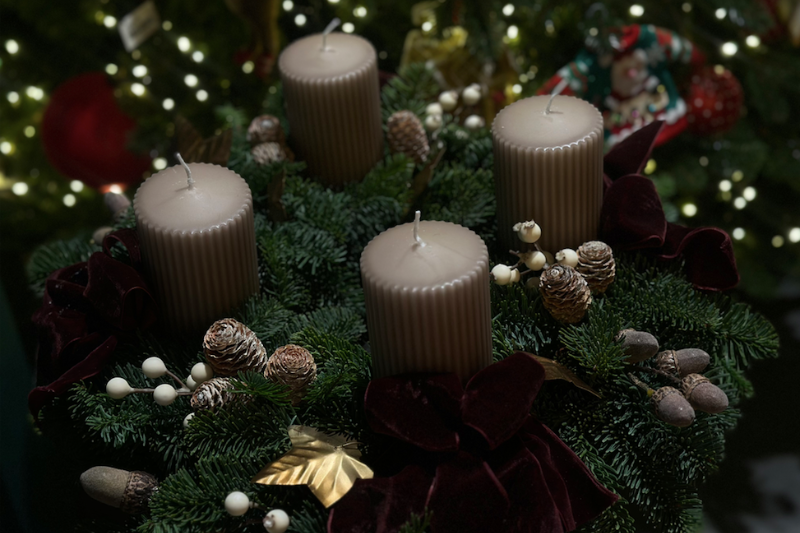 Consigue la corona de adviento llena de tradición. Elaborada por nuestros floristas, esta corona combina follaje verde, velas que aportarán un ambiente cálido y decoraciones cuidadosamente seleccionadas, como piñas, bellotas (complementos naturales y artificiales) que evocan el espíritu navideño.