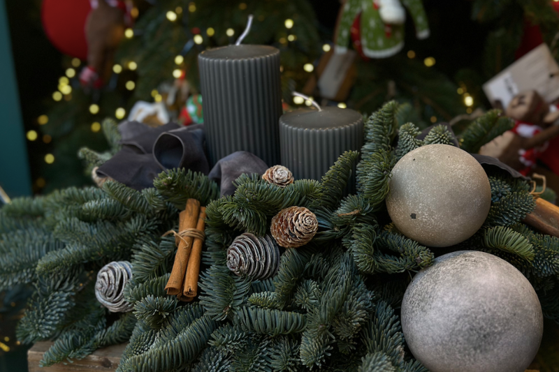 Decora tu mesa de navidad con nuestro centro de velas grises. Elaborado por floristas, el centro de mesa incluye dos velas grises junto con una combinación de verdes navideños naturales, detalles como piñas, lazada de terciopelo y bolas decorativas.
