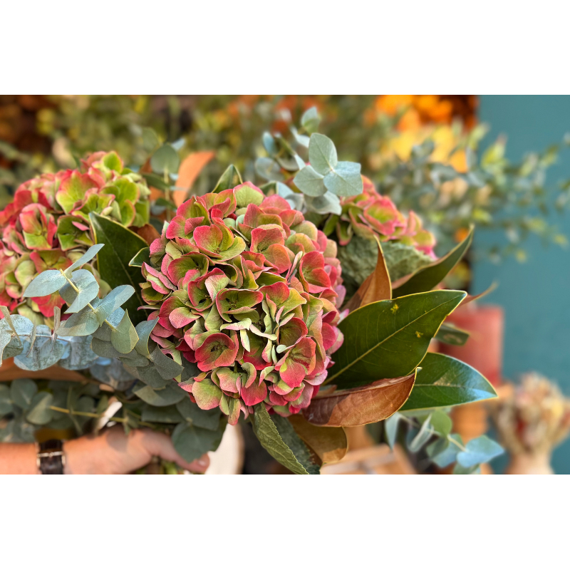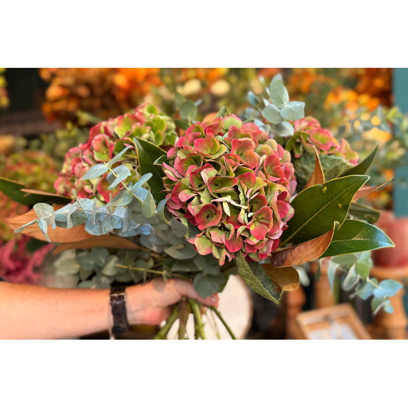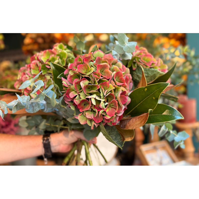 El ramo promoción otoño incluye 3 hortensias, eucalipto y magnolia.