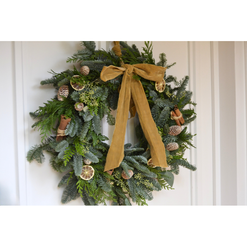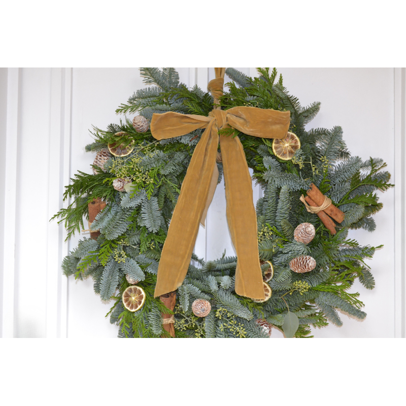 Corona de puerta para navidad. Conseguirás dar la bienvenida a la navidad con elegancia, ya sea en la puerta, sobre una chimenea o en una pared especial. La corona elaborada con verdes naturales, lazada de terciopelo y adornada con piñas naturales y rodajas de naranja seca, creando una combinación clásica y sofisticada que llenará de encanto la entrada de tu hogar.