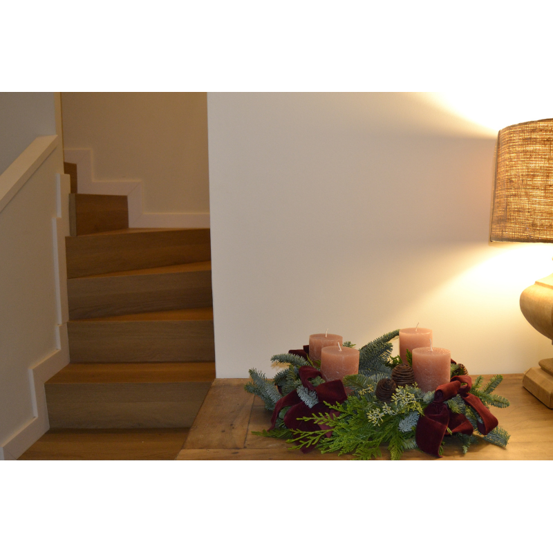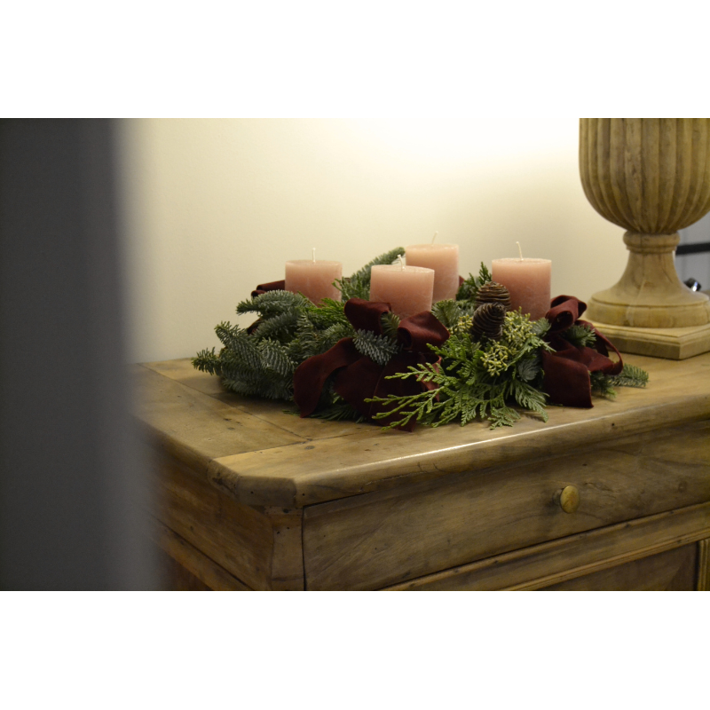 Corona de adviento con vela color arena, elaborada con abeto natural y verdes variados, incluye complementos naturales como piñas, canelas, etc. 4 velas, duración 25h, lazada de terciopelo color vino. Perfecta para colocar en mesas, recibidores o como centro de decoración navideña.