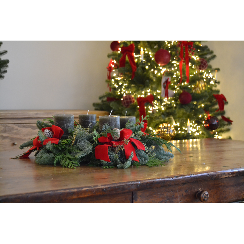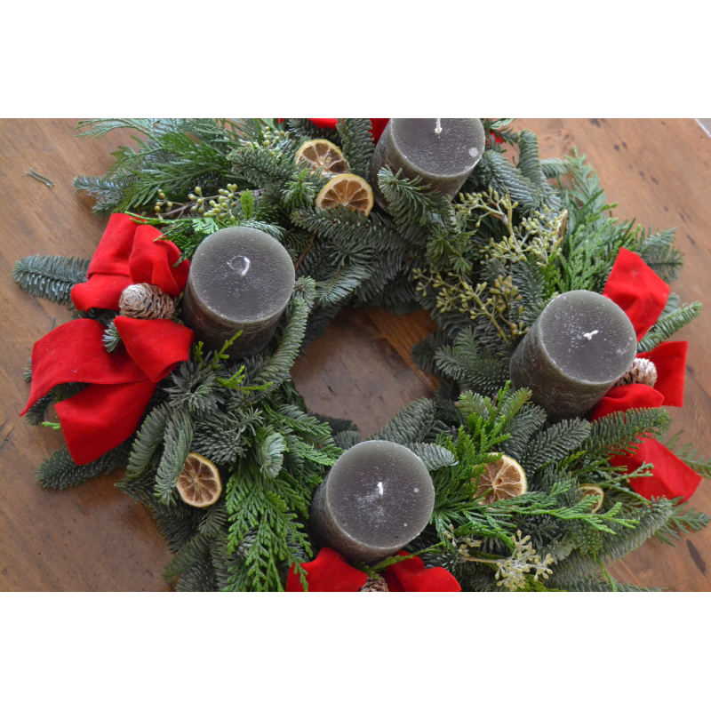 Corona de adviento con vela color verde, elaborada con abeto natural y verdes variados, incluye complementos naturales como piñas, rodaja de naranja seca, etc. 4 velas, duración 25h, lazada de terciopelo roja. Perfecta para colocar en mesas, recibidores o como centro de decoración navideña.