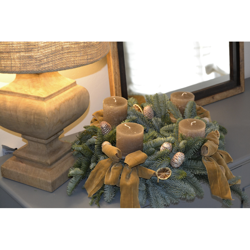 Corona de adviento con vela color piedra, elaborada con abeto natural, incluye complementos naturales como piñas, rodajas de naranja seca, etc. 4 velas, duración 25h, lazada de terciopelo mostaza. Perfecta para colocar en mesas, recibidores o como centro de decoración navideña.