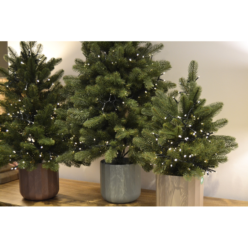 Cada árbol está elaborado con materiales de alta calidad que imitan la textura y color del follaje natural, garantizando una apariencia fresca y duradera.