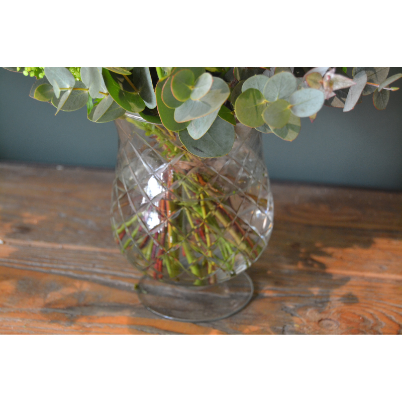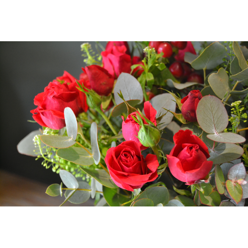Celebra el amor en cada detalle. Esta elegante copa de cristal tallado con el ramo de rosas rojas ramificadas, acompañadas de verdes variados que aportan frescura y equilibrio al conjunto. Una pieza sofisticada y atemporal, perfecta para decorar mesas especiales, sorprender en San Valentín o regalar un detalle lleno de significado.