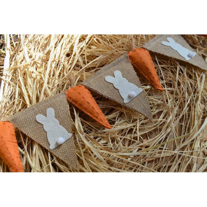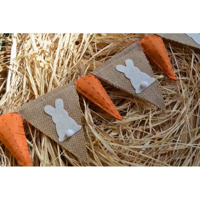 Guirnalda de zanahorias y conejitos de fieltro, de 0.80cm de longitud, ideal para decorar palmas y palmones, mesas de Pascua, habitaciones o cualquier rincón que quieras llenar de encanto primaveral. Un detalle alegre y colorido que aporta diversión y frescura a tus decoraciones