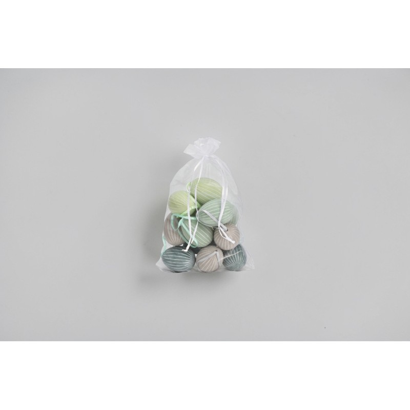 Decora tu hogar esta Pascua con esta bolsita de 12 huevos decorativos en tonos naturales. Su combinación de colores verdosos y beige con delicadas rayas aporta un estilo elegante y muy primaveral, ideal para crear ambientes acogedores y sofisticados.