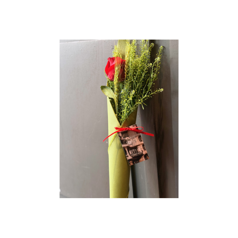 Regala la rosa de Sant Jordi con Távola. La rosa se presenta envuelta con un cono de tela verde, en su interior la tradicional rosa, espigas y talpsi. Disponible envío a domicilio.