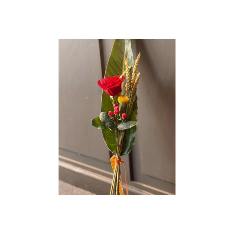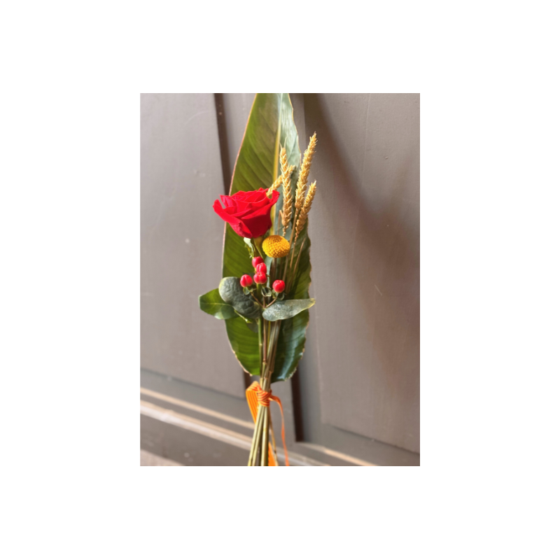 Regala la rosa de Sant Jordi con Távola. La rosa se presenta envuelta con hoja (ave del paraiso), en su interior la tradicional rosa, espigas y hypericum y craspedia. Disponible envío a domicilio.