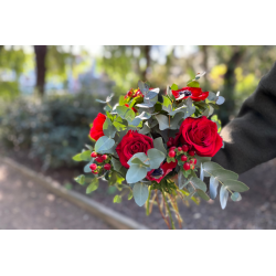 Ramo de 3 rosas rojas con anémonas e hypericum con eucalipto. Es un ramo ideal para regalar para el día de los enamorados. Disponible para envío a domicilio o recogida en tienda.